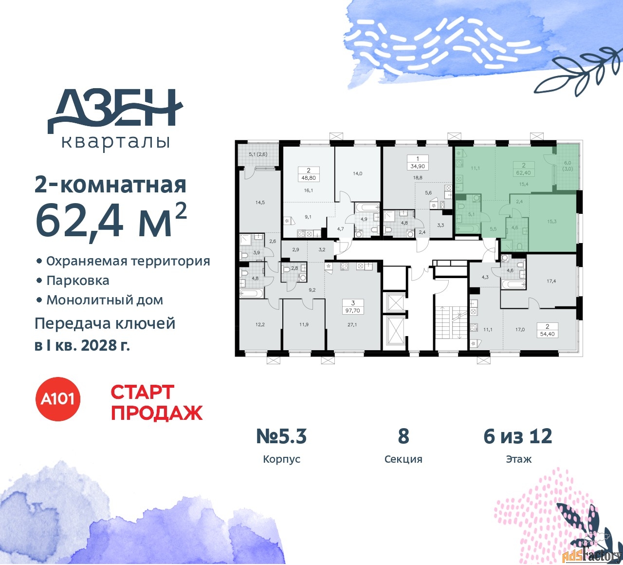 Дом монолитный, трехподъездный, переменной этажности, от 8 до 12 этажей. Квартира находится в 3-й секции высотой 12 этажей в корпусе бизнес-класса 5.3. На этаже 5 квартир. В подъезде 1 пассажирский и 1 грузовой лифт. Начало строительства - 3 квартал 2025 года. Окончание строительства - 1 квартал 2028 года. Оформление сделки по договору долевого участия.