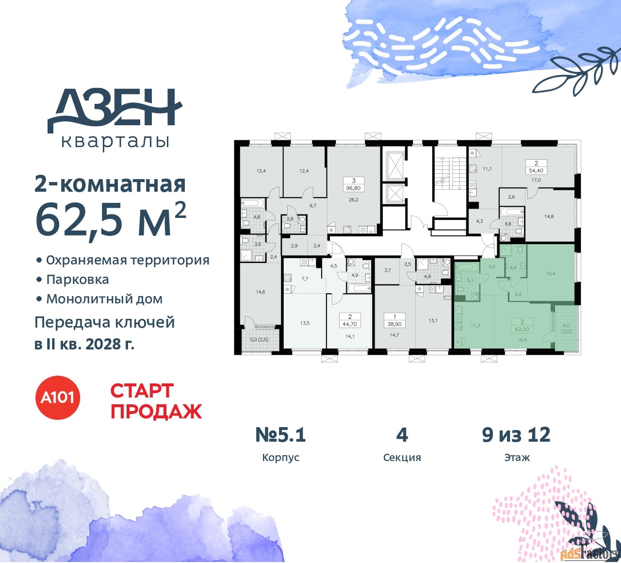 Дом монолитный, черырехподъездный, переменной этажности, от 8 до 12 этажей. Квартира находится в 4-й секции высотой 12 этажей в корпусе бизнес-класса 5.1. На этаже 5 квартир. В подъезде 1 пассажирский и 1 грузовой лифт. Начало строительства - 3 квартал 2025 года. Окончание строительства - 2 квартал 2028 года. Оформление сделки по договору долевого участия.