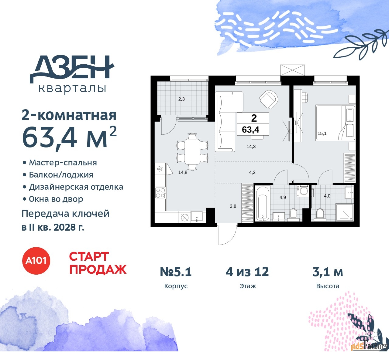 Дом монолитный, черырехподъездный, переменной этажности, от 8 до 12 этажей. Квартира находится в 1-й секции высотой 12 этажей в корпусе бизнес-класса 5.1. На этаже 4 квартиры. В подъезде 1 пассажирский и 1 грузовой лифт. Начало строительства - 3 квартал 2025 года. Окончание строительства - 2 квартал 2028 года. Оформление сделки по договору долевого участия.