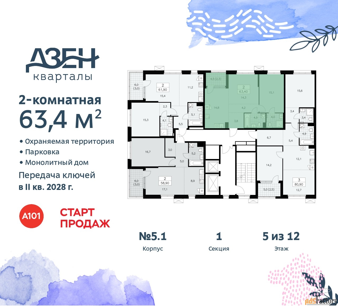 Дом монолитный, черырехподъездный, переменной этажности, от 8 до 12 этажей. Квартира находится в 1-й секции высотой 12 этажей в корпусе бизнес-класса 5.1. На этаже 4 квартиры. В подъезде 1 пассажирский и 1 грузовой лифт. Начало строительства - 3 квартал 2025 года. Окончание строительства - 2 квартал 2028 года. Оформление сделки по договору долевого участия.