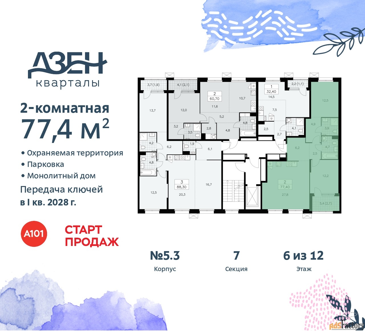 Дом монолитный, трехподъездный, переменной этажности, от 8 до 12 этажей. Квартира находится во 2-й секции высотой 8 этажей в корпусе бизнес-класса 5.3. На этаже 4 квартиры. В подъезде 1 грузовой лифт. Начало строительства - 3 квартал 2025 года. Окончание строительства - 1 квартал 2028 года. Оформление сделки по договору долевого участия.