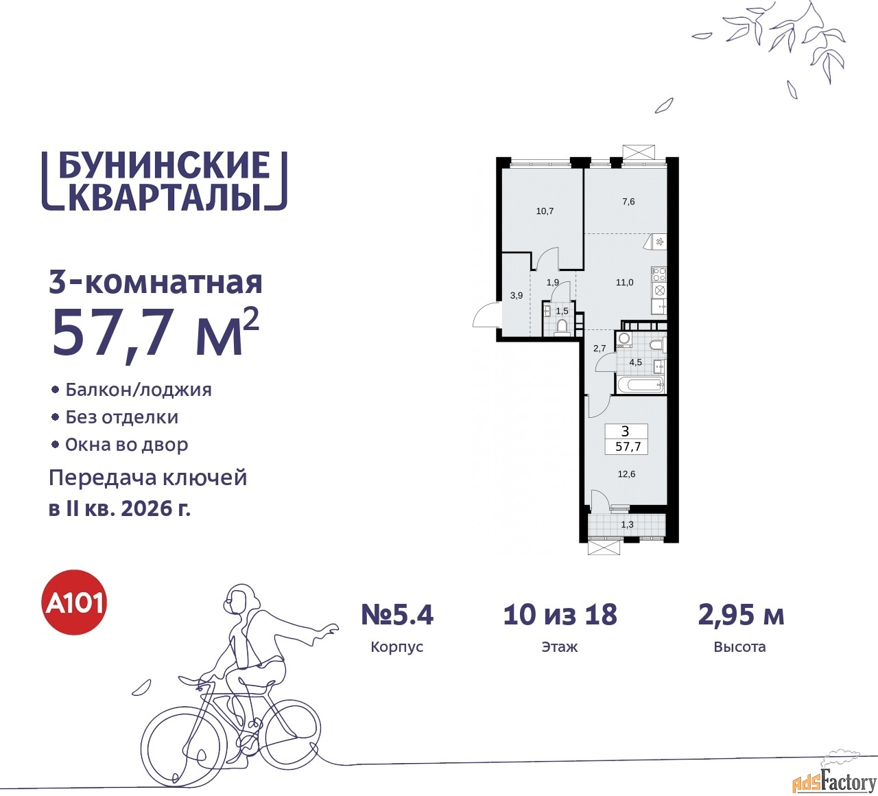 Дом монолитный, черырехподъездный, переменной этажности, от 9 до 18 этажей. Квартира находится в 1-й секции высотой 18 этажей в корпусе 5.4. На этаже 5 квартир. В подъезде 1 пассажирский и 1 грузовой лифт. Начало строительства - 4 квартал 2023 года. Окончание строительства - 2 квартал 2026 года. Оформление сделки по договору долевого участия.