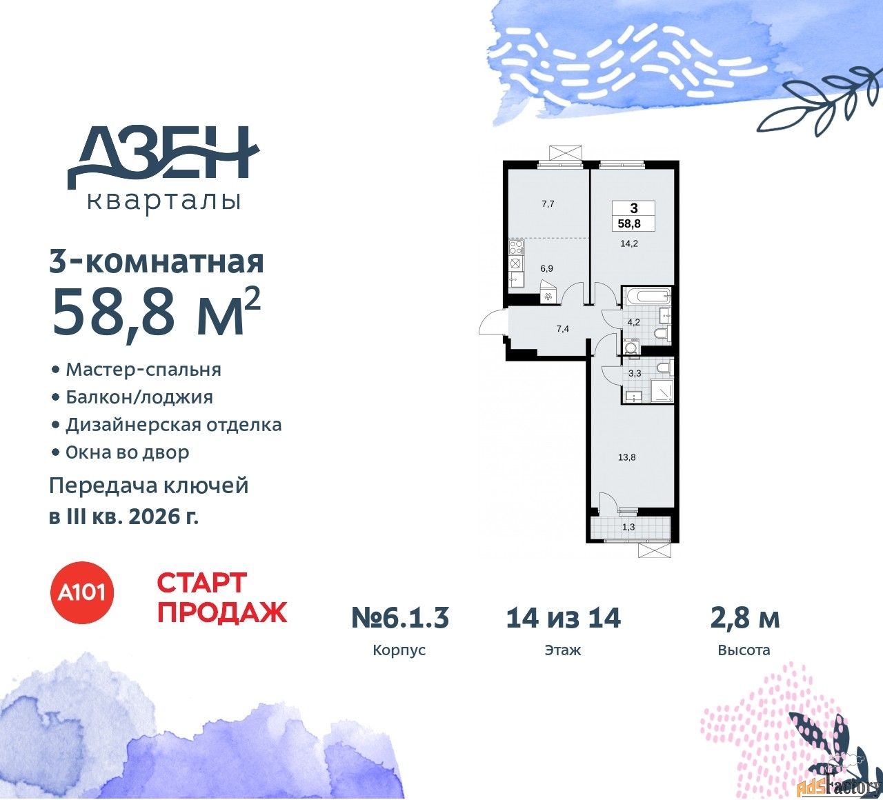 Дом монолитный, многоподъездный, переменной этажности, от 9 до 14 этажей. Квартира находится в 1-й секции высотой 14 этажей в корпусе 6.1.3. На этаже 5 квартир. В подъезде 1 пассажирский и 1 грузовой лифт. Начало строительства - 4 квартал 2023 года. Окончание строительства - 3 квартал 2026 года. Оформление сделки по договору долевого участия.
