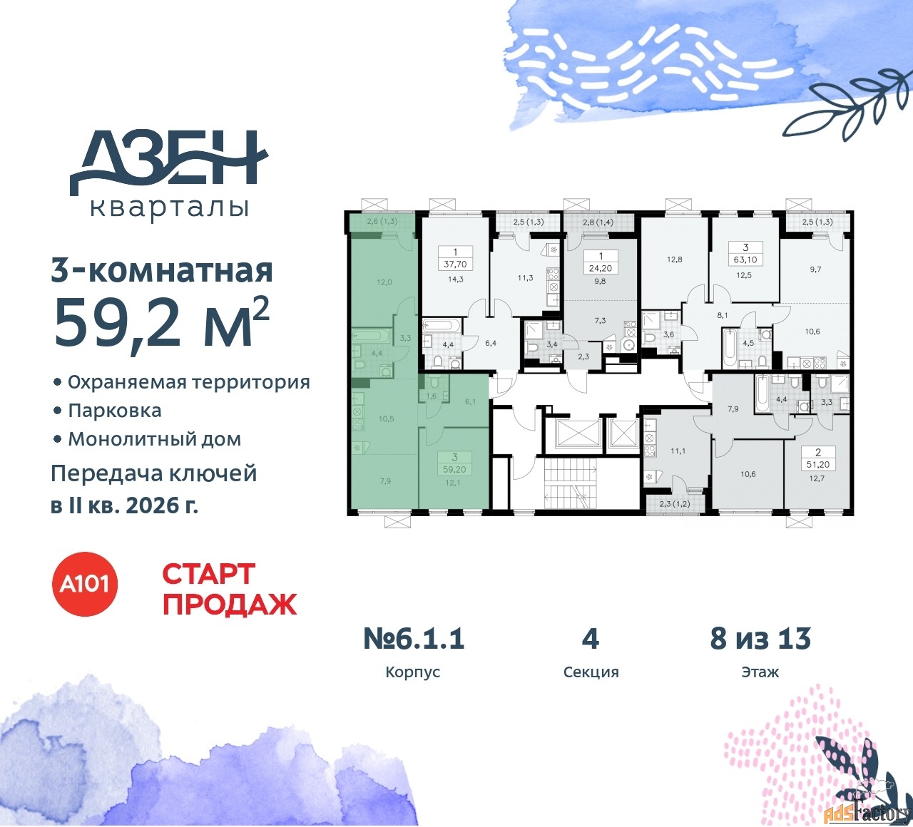 Дом монолитный, многоподъездный, переменной этажности, от 9 до 13 этажей. Квартира находится в 4-й секции высотой 11 этажей в корпусе 6.1.1. На этаже 5 квартир. В подъезде 1 пассажирский и 1 грузовой лифт. Начало строительства - 4 квартал 2023 года. Окончание строительства - 2 квартал 2026 года. Оформление сделки по договору долевого участия.