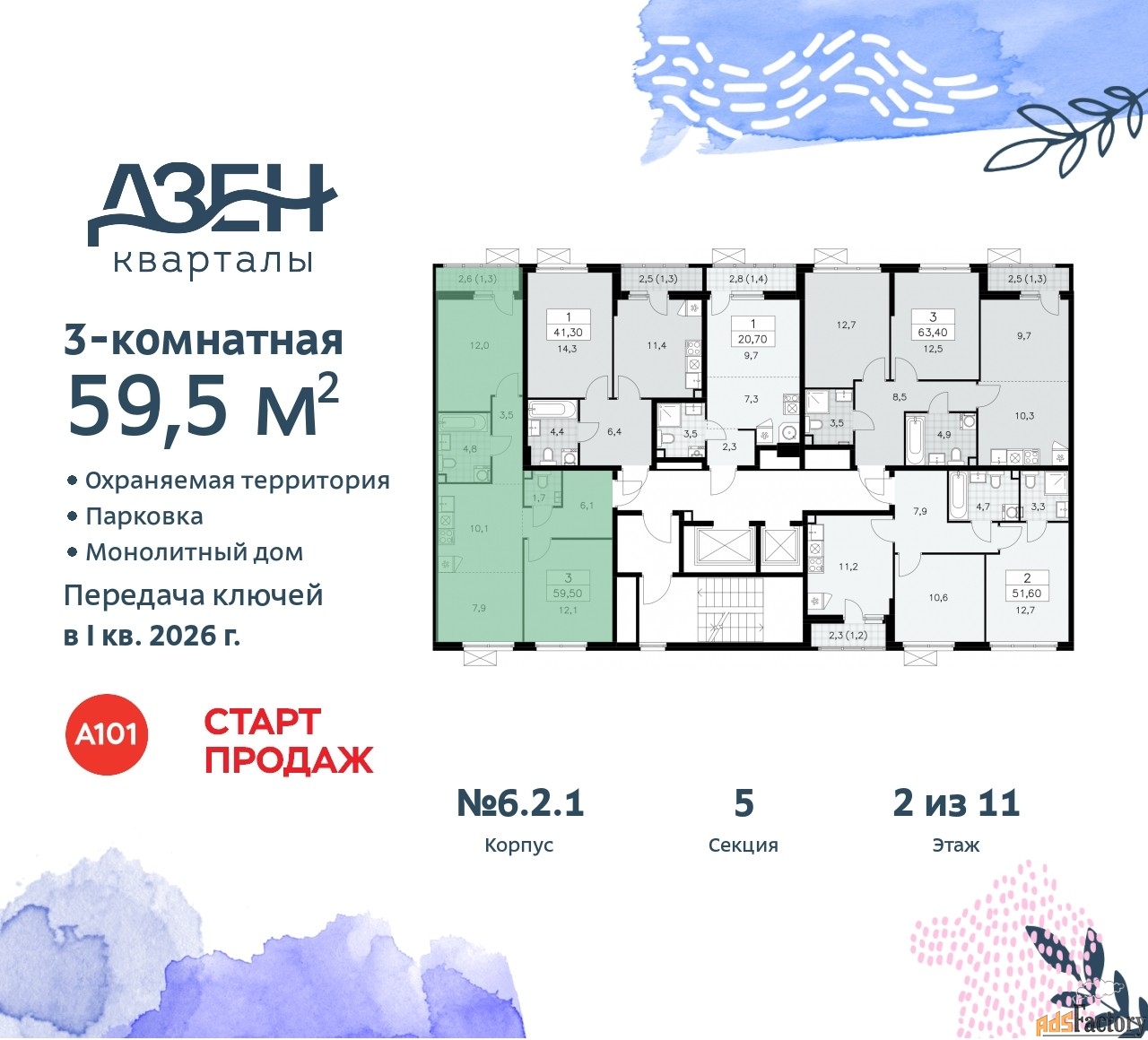 Дом монолитный, многоподъездный, переменной этажности, от 8 до 11 этажей. Квартира находится в 5-й секции высотой 11 этажей в корпусе 6.2.1. На этаже 5 квартир. В подъезде 1 пассажирский и 1 грузовой лифт. Начало строительства - 4 квартал 2023 года. Окончание строительства - 1 квартал 2026 года. Оформление сделки по договору долевого участия.