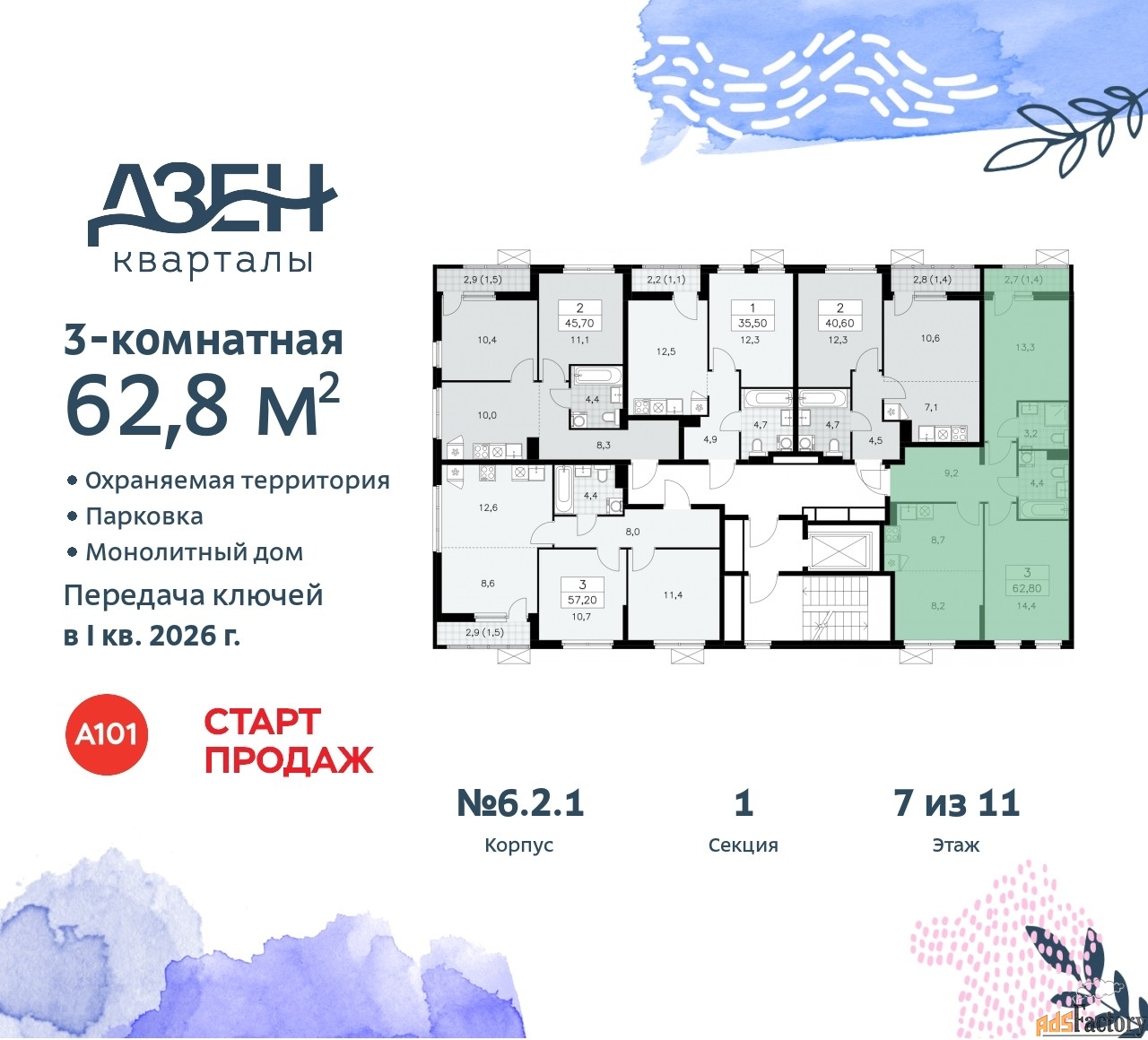 Дом монолитный, многоподъездный, переменной этажности, от 8 до 11 этажей. Квартира находится в 1-й секции высотой 8 этажей в корпусе 6.2.1. На этаже 5 квартир. В подъезде 1 грузовой лифт. Начало строительства - 4 квартал 2023 года. Окончание строительства - 1 квартал 2026 года. Оформление сделки по договору долевого участия.