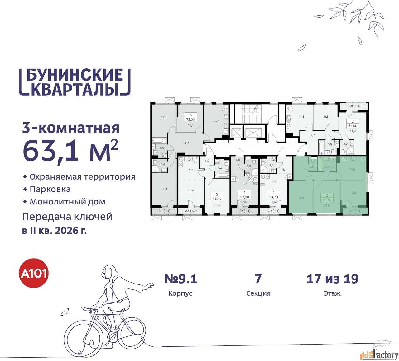 Дом монолитный, многоподъездный, переменной этажности, от 9 до 19 этажей. Квартира находится в 7-й секции высотой 19 этажей в корпусе 9.1. На этаже 6 квартир. В подъезде 1 пассажирский и 1 грузовой лифт. Начало строительства - 4 квартал 2023 года. Окончание строительства - 2 квартал 2026 года. Оформление сделки по договору долевого участия.