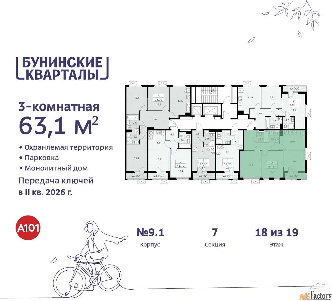 Дом монолитный, многоподъездный, переменной этажности, от 9 до 19 этажей. Квартира находится в 7-й секции высотой 19 этажей в корпусе 9.1. На этаже 6 квартир. В подъезде 1 пассажирский и 1 грузовой лифт. Начало строительства - 4 квартал 2023 года. Окончание строительства - 2 квартал 2026 года. Оформление сделки по договору долевого участия.