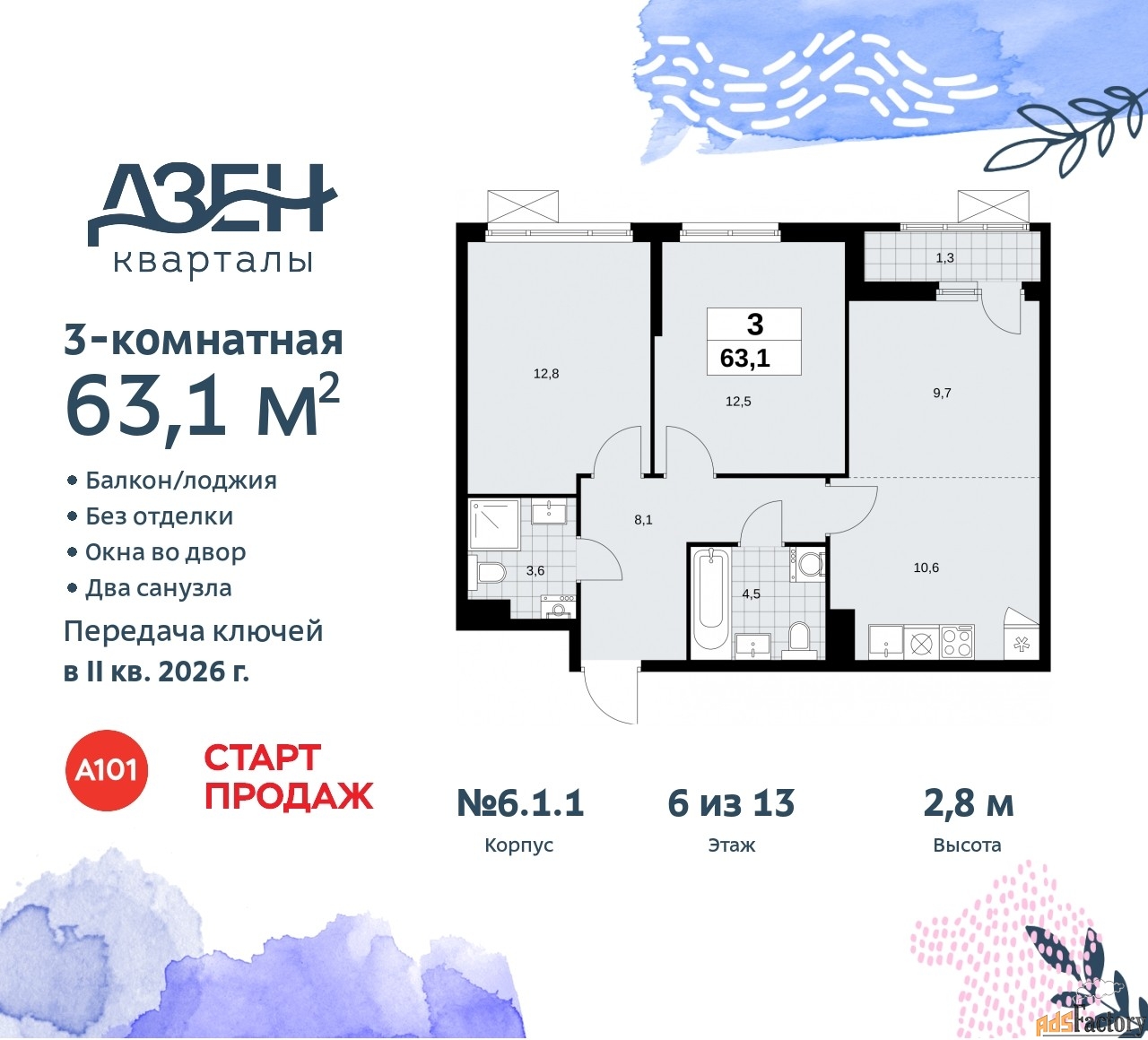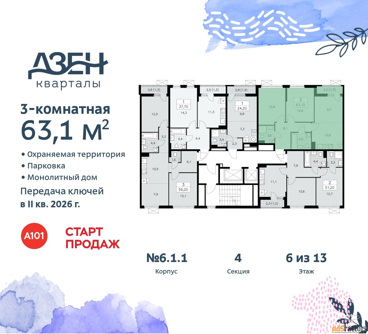 Дом монолитный, многоподъездный, переменной этажности, от 9 до 13 этажей. Квартира находится в 4-й секции высотой 11 этажей в корпусе 6.1.1. На этаже 5 квартир. В подъезде 1 пассажирский и 1 грузовой лифт. Начало строительства - 4 квартал 2023 года. Окончание строительства - 2 квартал 2026 года. Оформление сделки по договору долевого участия.