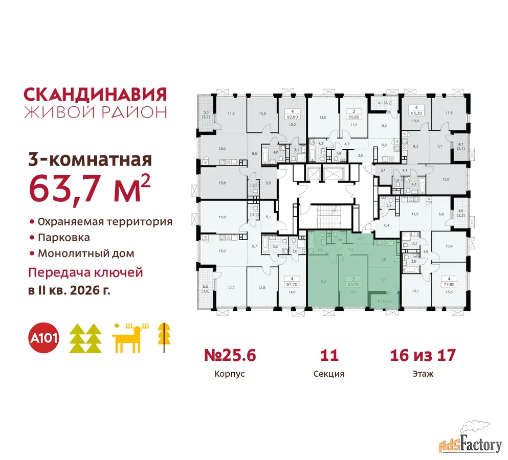 Квартира находится в корпусе 2.25.6. Дом монолитный, одноподъездный, высотой 17 этажей. На этаже 6 квартир. В подъезде 1 пассажирский и 1 грузовой лифт. Начало строительства - 4 квартал 2023 года. Окончание строительства - 2 квартал 2026 года. Оформление сделки по договору долевого участия.