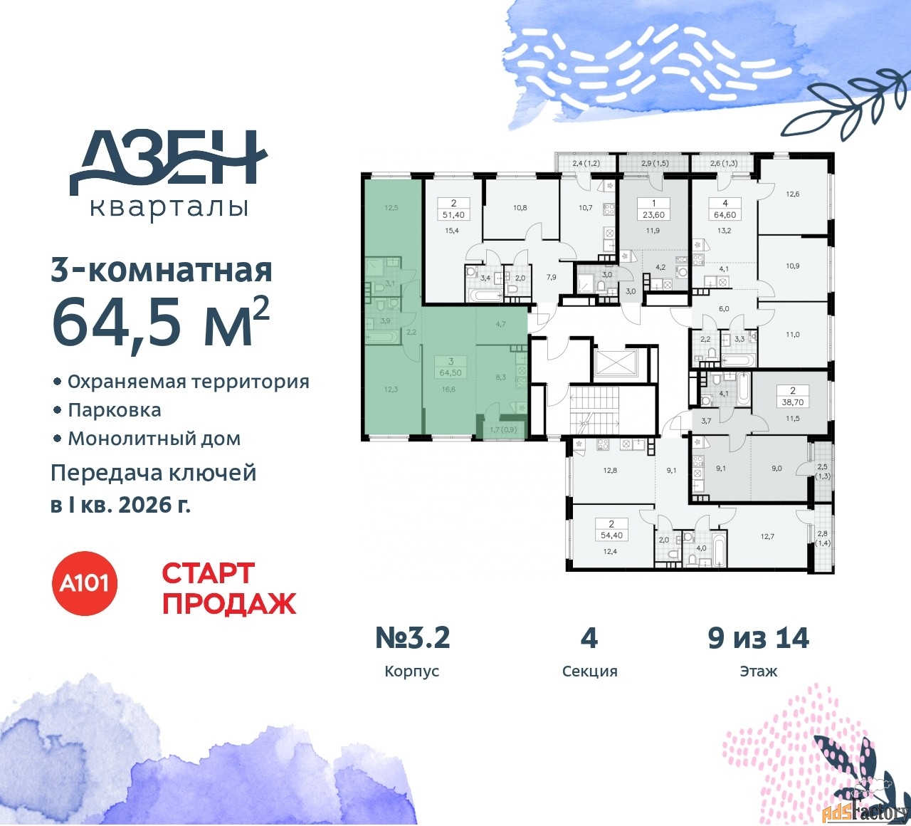Дом монолитный, многоподъездный, переменной этажности, от 9 до 14 этажей. Квартира находится в 3-й секции высотой 9 этажей в корпусе 3.2. На этаже 6 квартир. В подъезде 1 грузовой лифт. Начало строительства - 3 квартал 2023 года. Окончание строительства - 1 квартал 2026 года. Оформление сделки по договору долевого участия.