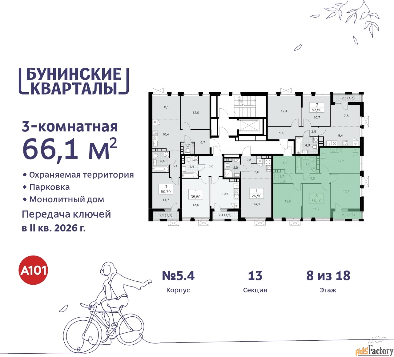 Дом монолитный, черырехподъездный, переменной этажности, от 9 до 18 этажей. Квартира находится в 4-й секции высотой 9 этажей в корпусе 5.4. На этаже 5 квартир. В подъезде 1 грузовой лифт. Начало строительства - 4 квартал 2023 года. Окончание строительства - 2 квартал 2026 года. Оформление сделки по договору долевого участия.
