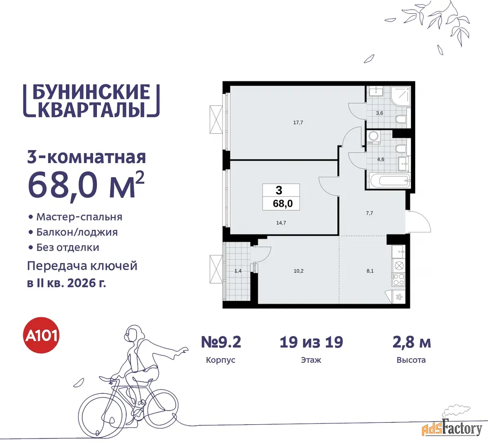 Квартира находится в корпусе 9.2. Дом монолитный, одноподъездный, высотой 19 этажей. На этаже 6 квартир. В подъезде 1 пассажирский и 1 грузовой лифт. Начало строительства - 4 квартал 2023 года. Окончание строительства - 2 квартал 2026 года. Оформление сделки по договору долевого участия.