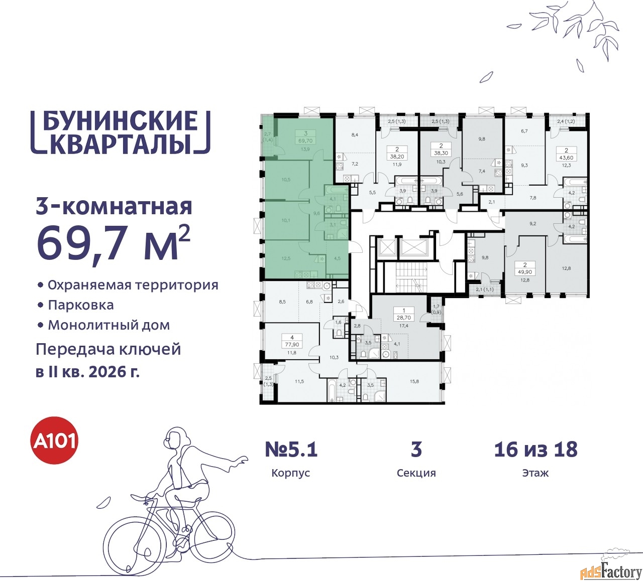 Дом монолитный, многоподъездный, переменной этажности, от 9 до 18 этажей. Квартира находится в 3-й секции высотой 18 этажей в корпусе 5.1. На этаже 7 квартир. В подъезде 1 пассажирский и 1 грузовой лифт. Начало строительства - 4 квартал 2023 года. Окончание строительства - 2 квартал 2026 года. Оформление сделки по договору долевого участия.