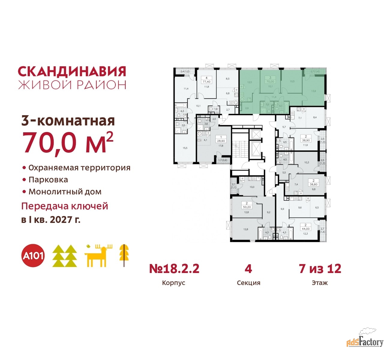 Дом монолитный, двухподъездный, высотой 12 этажей. Квартира находится во 2-й секции в корпусе 2.18.2.2. На этаже 7 квартир. В подъезде 1 пассажирский и 1 грузовой лифт. Начало строительства - 1 квартал 2024 года. Окончание строительства - 1 квартал 2027 года. Оформление сделки по договору долевого участия.