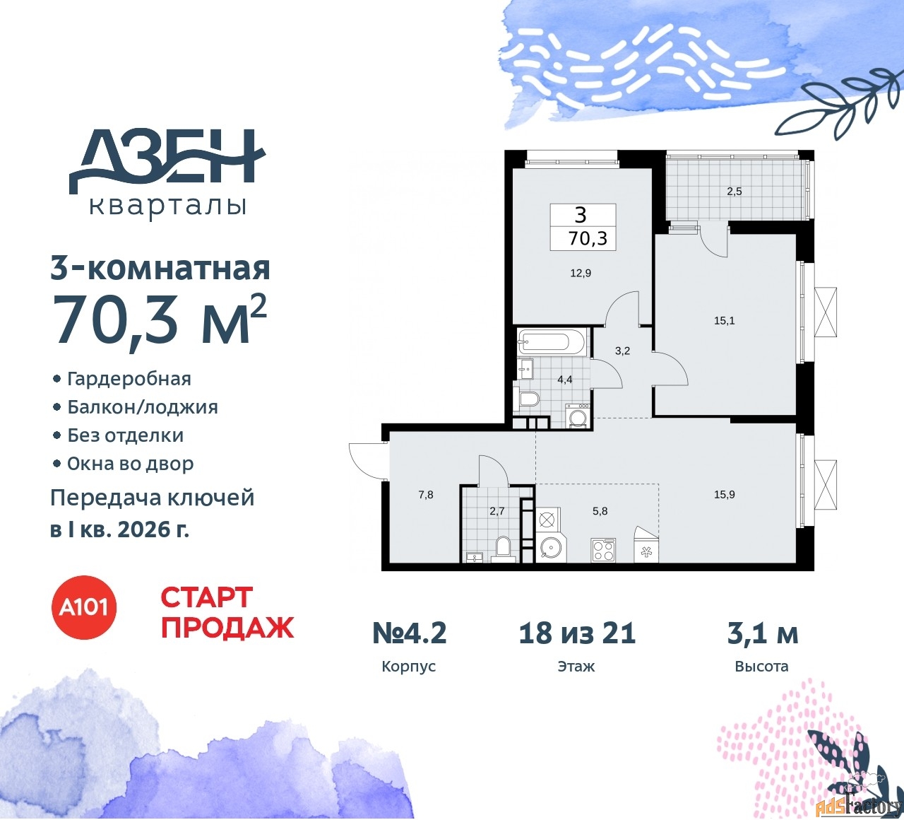 Квартира находится в корпусе 4.2. Дом монолитный, одноподъездный, высотой 21 этаж. На этаже 7 квартир. В подъезде 1 пассажирский и 2 грузовых лифта. Начало строительства - 3 квартал 2023 года. Окончание строительства - 1 квартал 2026 года. Оформление сделки по договору долевого участия.