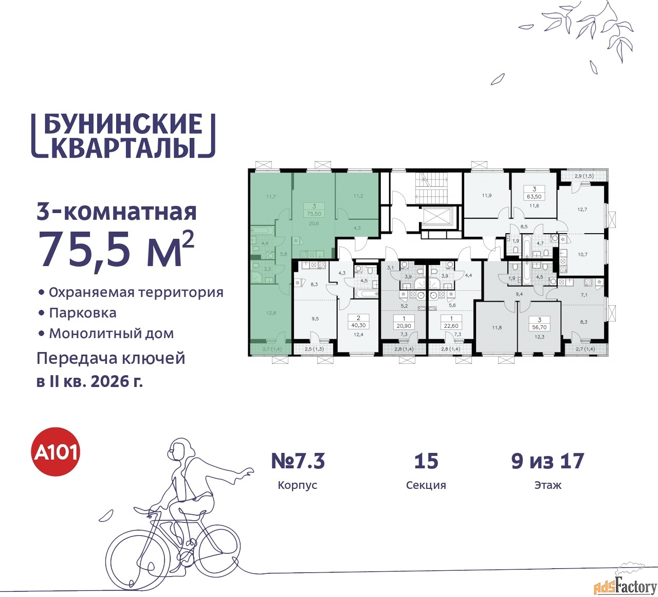 Дом монолитный, многоподъездный, переменной этажности, от 9 до 17 этажей. Квартира находится в 7-й секции высотой 9 этажей в корпусе 7.3. На этаже 6 квартир. В подъезде 1 грузовой лифт. Начало строительства - 4 квартал 2023 года. Окончание строительства - 2 квартал 2026 года. Оформление сделки по договору долевого участия.