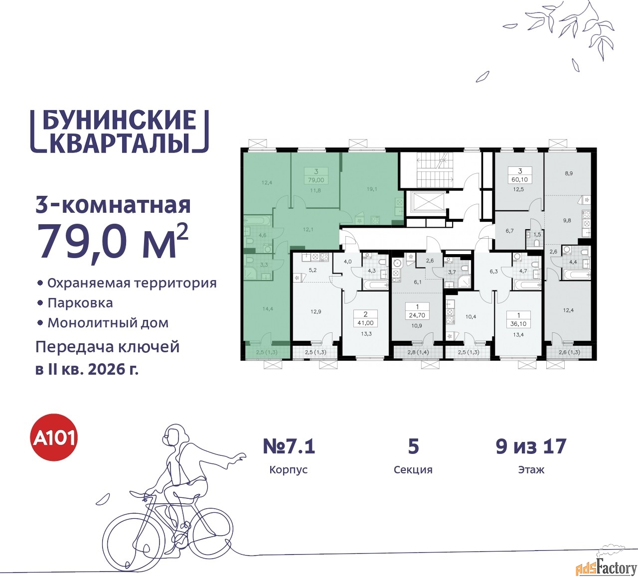 Дом монолитный, многоподъездный, переменной этажности, от 9 до 17 этажей. Квартира находится в 5-й секции высотой 9 этажей в корпусе 7.1. На этаже 5 квартир. В подъезде 1 грузовой лифт. Начало строительства - 4 квартал 2023 года. Окончание строительства - 2 квартал 2026 года. Оформление сделки по договору долевого участия.