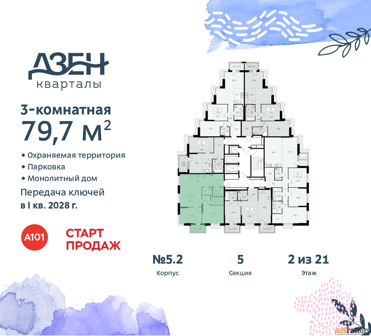 Квартира находится в корпусе 5.2. Дом монолитный, одноподъездный, высотой 21 этаж. На этаже 6 квартир. В подъезде 1 пассажирский и 2 грузовых лифта. Начало строительства - 3 квартал 2025 года. Окончание строительства - 1 квартал 2028 года. Оформление сделки по договору долевого участия.
