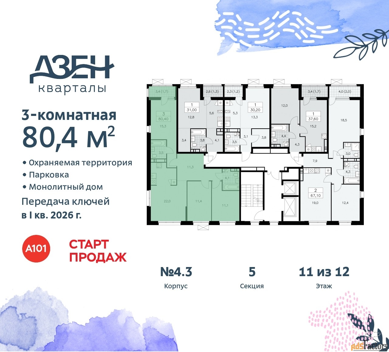 Дом монолитный, черырехподъездный, переменной этажности, от 8 до 12 этажей. Квартира находится в 1-й секции высотой 12 этажей в корпусе бизнес-класса 4.3. На этаже 5 квартир. В подъезде 1 пассажирский и 1 грузовой лифт. Начало строительства - 3 квартал 2023 года. Окончание строительства - 1 квартал 2026 года. Оформление сделки по договору долевого участия.