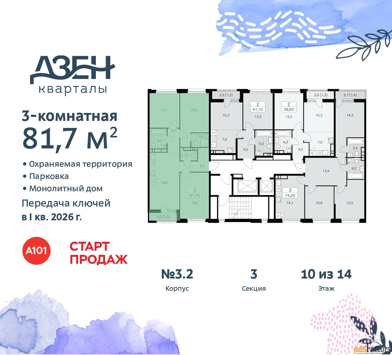Дом монолитный, многоподъездный, переменной этажности, от 9 до 14 этажей. Квартира находится во 2-й секции высотой 12 этажей в корпусе 3.2. На этаже 4 квартиры. В подъезде 1 пассажирский и 1 грузовой лифт. Начало строительства - 3 квартал 2023 года. Окончание строительства - 1 квартал 2026 года. Оформление сделки по договору долевого участия.