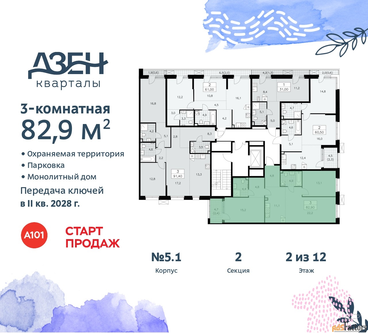 Дом монолитный, черырехподъездный, переменной этажности, от 8 до 12 этажей. Квартира находится во 2-й секции высотой 8 этажей в корпусе бизнес-класса 5.1. На этаже 5 квартир. В подъезде 1 грузовой лифт. Начало строительства - 3 квартал 2025 года. Окончание строительства - 2 квартал 2028 года. Оформление сделки по договору долевого участия.