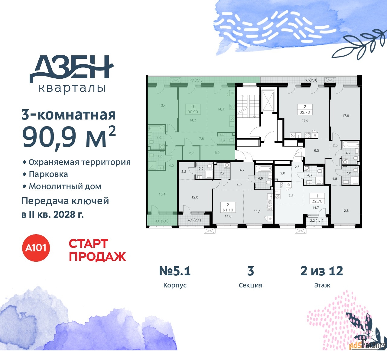 Дом монолитный, черырехподъездный, переменной этажности, от 8 до 12 этажей. Квартира находится в 3-й секции высотой 8 этажей в корпусе бизнес-класса 5.1. На этаже 4 квартиры. В подъезде 1 грузовой лифт. Начало строительства - 3 квартал 2025 года. Окончание строительства - 2 квартал 2028 года. Оформление сделки по договору долевого участия.