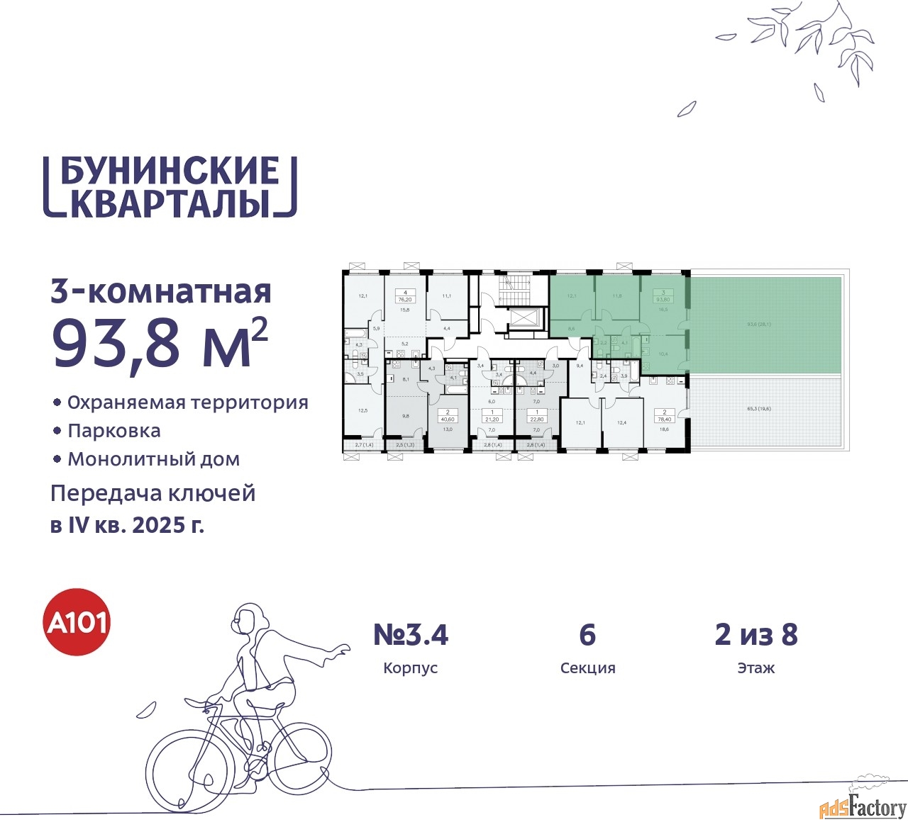 Дом монолитный, двухподъездный, высотой 8 этажей. Квартира находится во 2-й секции в корпусе 3.4. На этаже 6 квартир. В подъезде 1 грузовой лифт. Начало строительства - 2 квартал 2023 года. Окончание строительства - 4 квартал 2025 года. Оформление сделки по договору долевого участия.