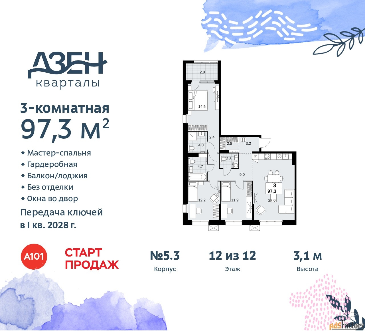 Дом монолитный, трехподъездный, переменной этажности, от 8 до 12 этажей. Квартира находится в 3-й секции высотой 12 этажей в корпусе бизнес-класса 5.3. На этаже 5 квартир. В подъезде 1 пассажирский и 1 грузовой лифт. Начало строительства - 3 квартал 2025 года. Окончание строительства - 1 квартал 2028 года. Оформление сделки по договору долевого участия.