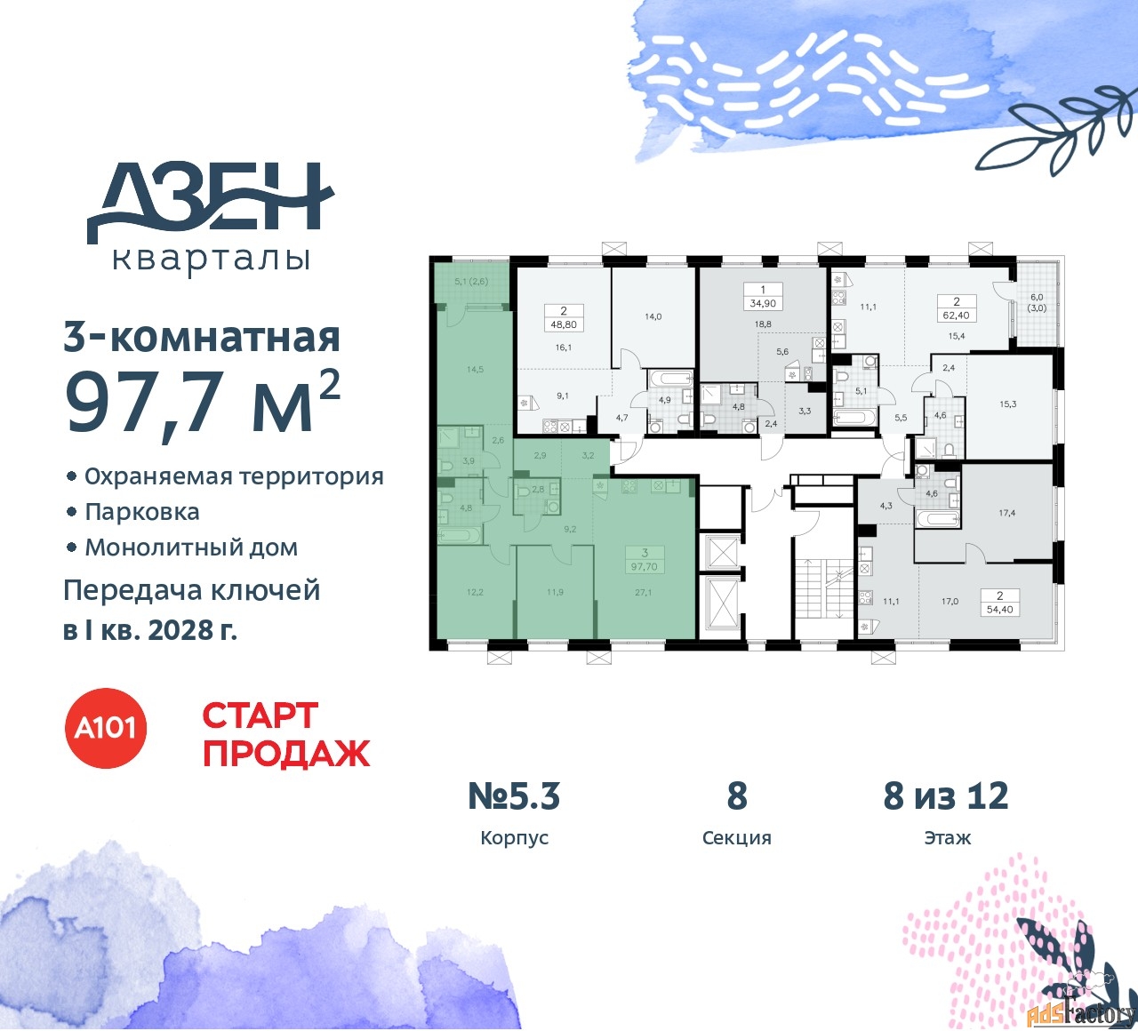 Дом монолитный, трехподъездный, переменной этажности, от 8 до 12 этажей. Квартира находится в 3-й секции высотой 12 этажей в корпусе бизнес-класса 5.3. На этаже 5 квартир. В подъезде 1 пассажирский и 1 грузовой лифт. Начало строительства - 3 квартал 2025 года. Окончание строительства - 1 квартал 2028 года. Оформление сделки по договору долевого участия.