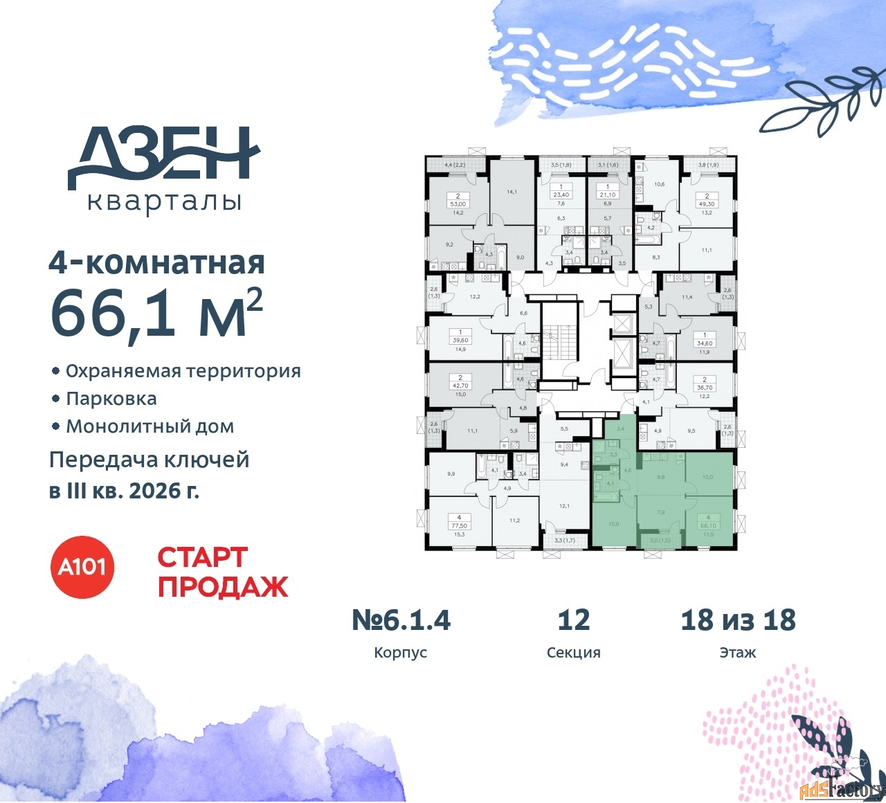 Квартира находится в корпусе 6.1.4. Дом монолитный, одноподъездный, высотой 18 этажей. На этаже 10 квартир. В подъезде 1 пассажирский и 1 грузовой лифт. Начало строительства - 4 квартал 2023 года. Окончание строительства - 3 квартал 2026 года. Оформление сделки по договору долевого участия.