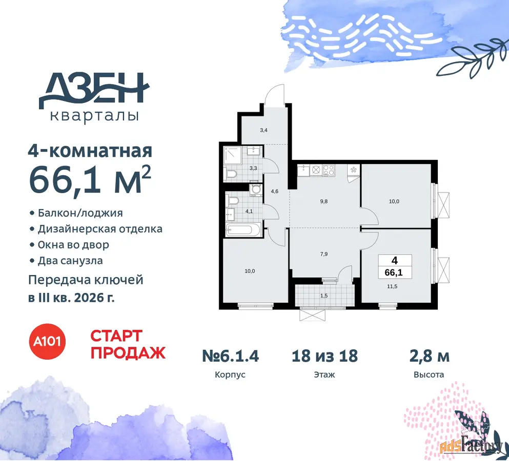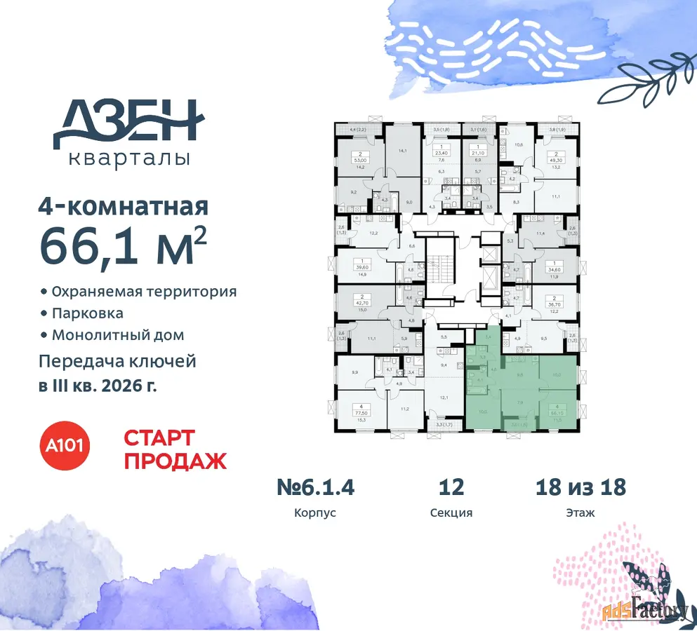 Квартира находится в корпусе 6.1.4. Дом монолитный, одноподъездный, высотой 18 этажей. На этаже 10 квартир. В подъезде 1 пассажирский и 1 грузовой лифт. Начало строительства - 4 квартал 2023 года. Окончание строительства - 3 квартал 2026 года. Оформление сделки по договору долевого участия.