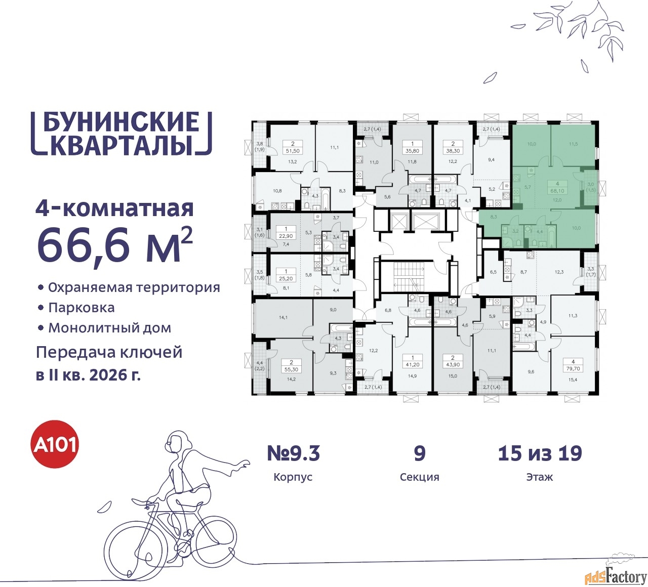 Квартира находится в корпусе 9.3. Дом монолитный, одноподъездный, высотой 19 этажей. На этаже 10 квартир. В подъезде 1 пассажирский и 1 грузовой лифт. Начало строительства - 4 квартал 2023 года. Окончание строительства - 2 квартал 2026 года. Оформление сделки по договору долевого участия.