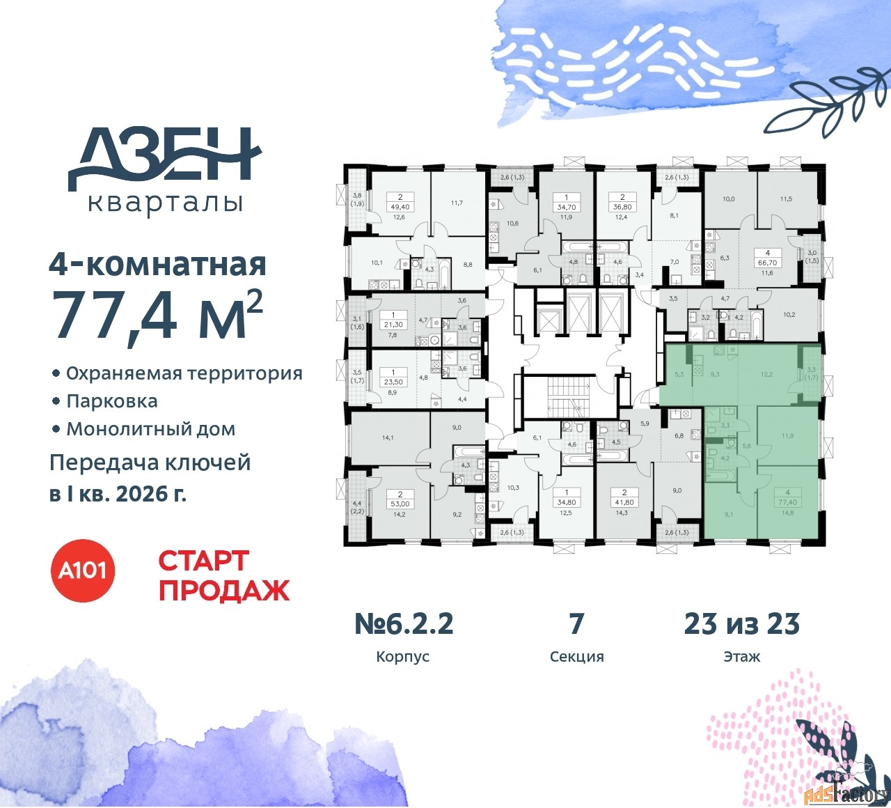 Квартира находится в корпусе 6.2.2. Дом монолитный, одноподъездный, высотой 23 этажа. На этаже 10 квартир. В подъезде 1 пассажирский и 2 грузовых лифта. Начало строительства - 4 квартал 2023 года. Окончание строительства - 1 квартал 2026 года. Оформление сделки по договору долевого участия.