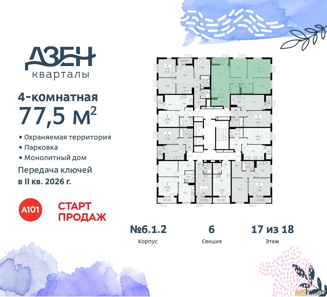 Квартира находится в корпусе 6.1.2. Дом монолитный, одноподъездный, высотой 18 этажей. На этаже 10 квартир. В подъезде 1 пассажирский и 1 грузовой лифт. Начало строительства - 4 квартал 2023 года. Окончание строительства - 2 квартал 2026 года. Оформление сделки по договору долевого участия.