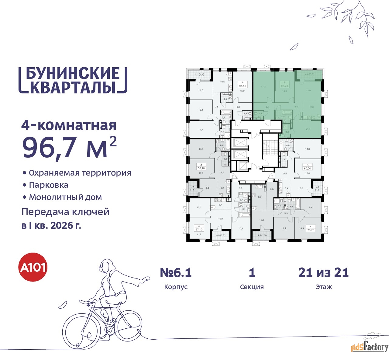 Квартира находится в корпусе 6.1. Дом монолитный, одноподъездный, высотой 21 этаж. На этаже 10 квартир. В подъезде 1 пассажирский и 2 грузовых лифта. Начало строительства - 3 квартал 2023 года. Окончание строительства - 1 квартал 2026 года. Оформление сделки по договору долевого участия.