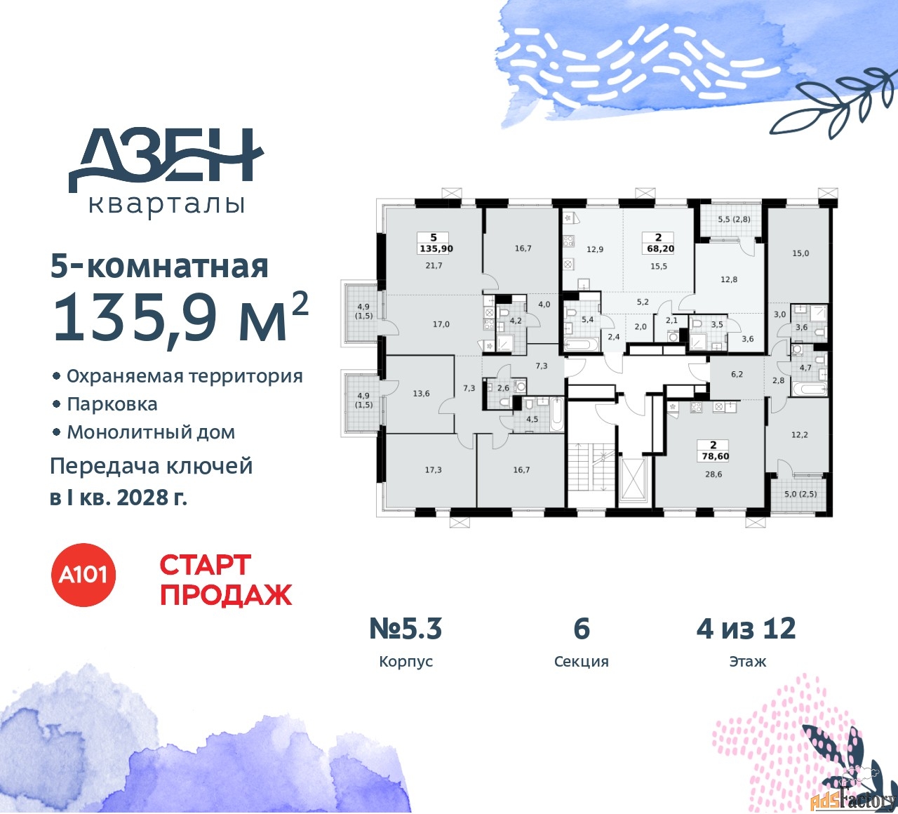 Дом монолитный, трехподъездный, переменной этажности, от 8 до 12 этажей. Квартира находится в 1-й секции высотой 8 этажей в корпусе бизнес-класса 5.3. На этаже 3 квартиры. В подъезде 1 грузовой лифт. Начало строительства - 3 квартал 2025 года. Окончание строительства - 1 квартал 2028 года. Оформление сделки по договору долевого участия.