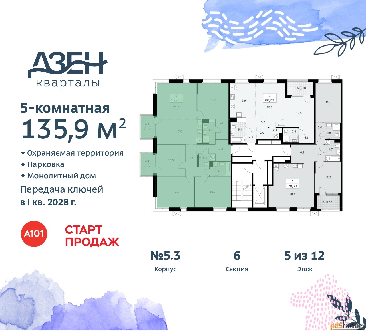 Дом монолитный, трехподъездный, переменной этажности, от 8 до 12 этажей. Квартира находится в 1-й секции высотой 8 этажей в корпусе бизнес-класса 5.3. На этаже 3 квартиры. В подъезде 1 грузовой лифт. Начало строительства - 3 квартал 2025 года. Окончание строительства - 1 квартал 2028 года. Оформление сделки по договору долевого участия.