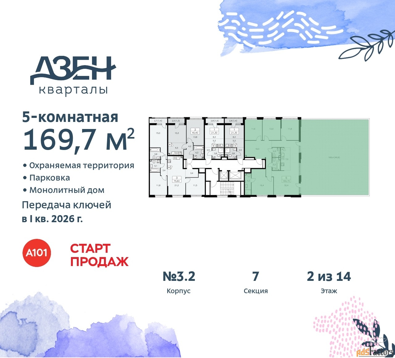 Дом монолитный, многоподъездный, переменной этажности, от 9 до 14 этажей. Квартира находится в 6-й секции высотой 14 этажей в корпусе 3.2. На этаже 6 квартир. В подъезде 1 пассажирский и 1 грузовой лифт. Начало строительства - 3 квартал 2023 года. Окончание строительства - 1 квартал 2026 года. Оформление сделки по договору долевого участия.