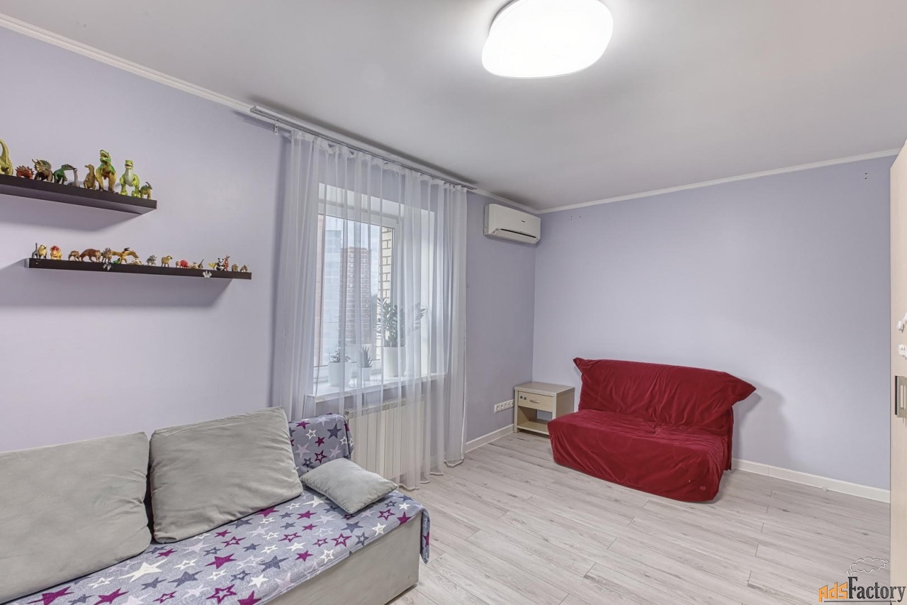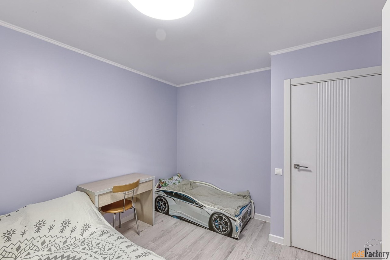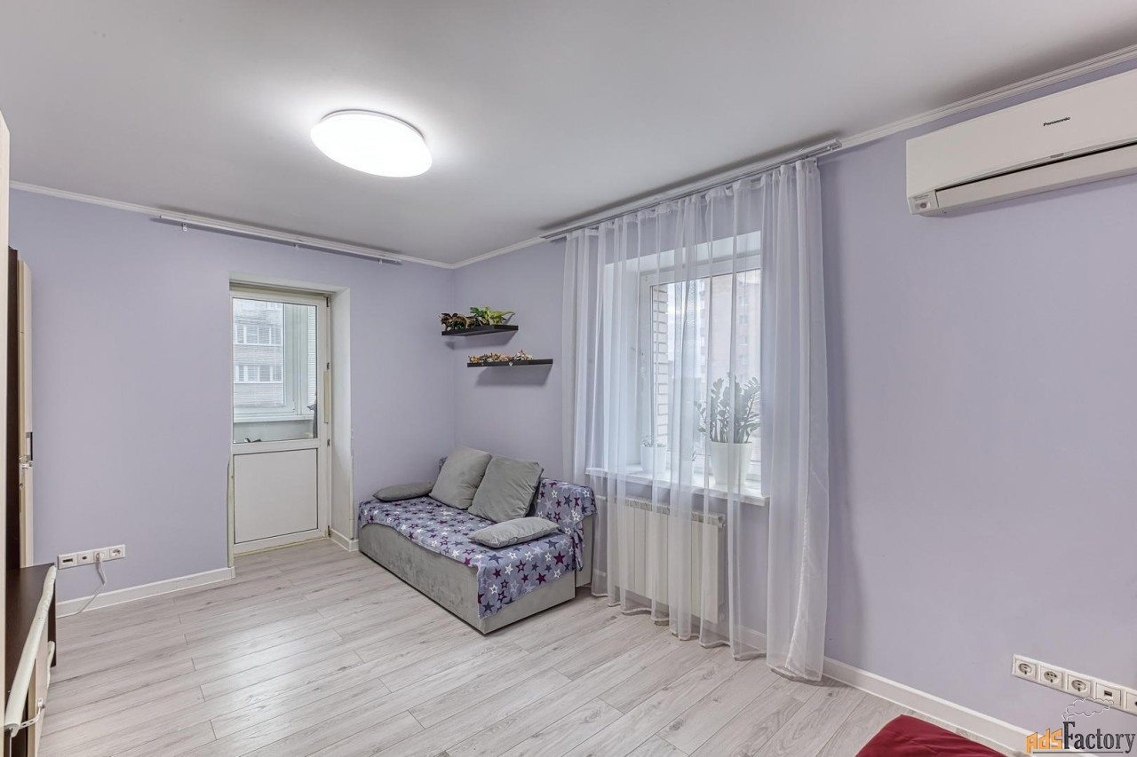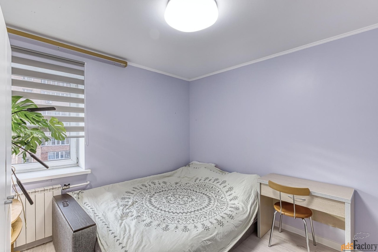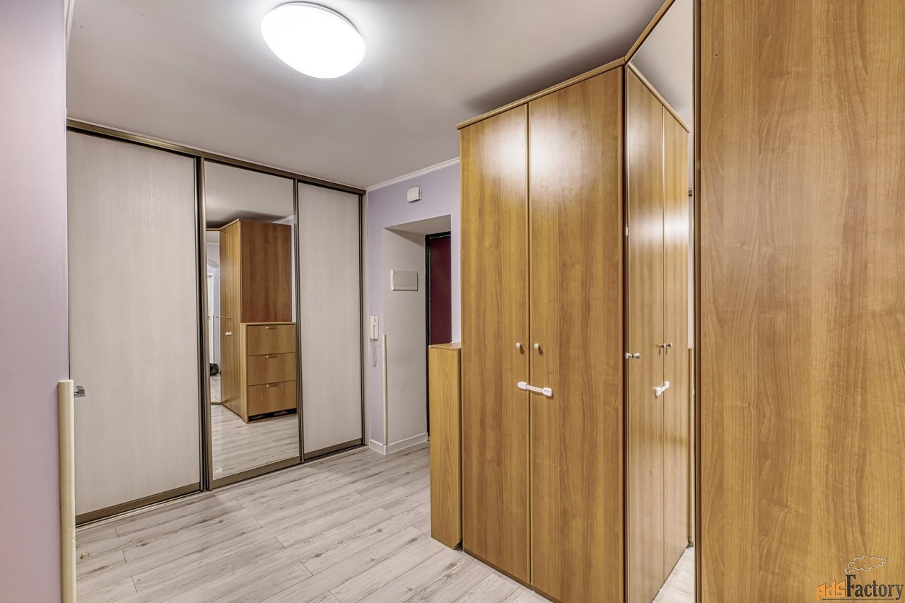 Квартира расположена на 9 этаже, две небольшие спальни, большая кухня и просторный хол, оборудованный шкафами для хранения. Кухонный гарнитур, шкафы в прихожей - остаются. Квартира в хорошем состоянии, косметический ремонт был сделан 2 года назад.
