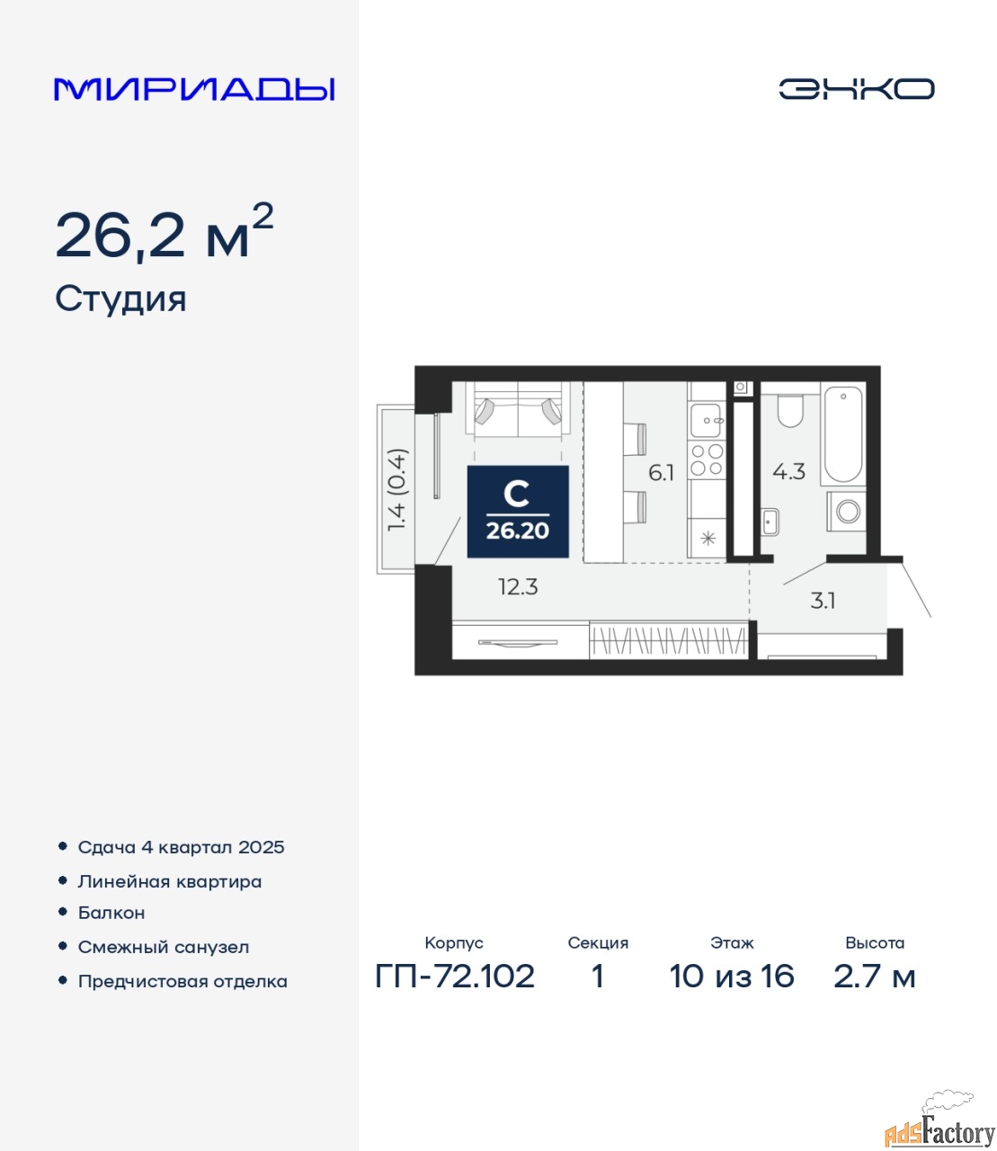 Дом монолитный, многоподъездный, переменной этажности, от 14 до 16 этажей. Квартира находится в 1-й секции высотой 16 этажей в корпусе ГП-72.102. На этаже 9 квартир. В подъезде 1 пассажирский и 1 грузовой лифт. Окончание строительства - 1 квартал 2026 года. Оформление сделки по договору долевого участия.