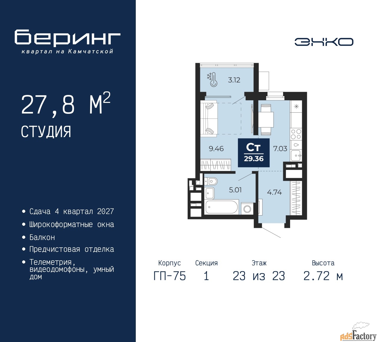 Дом монолитный, многоподъездный, переменной этажности, от 17 до 24 этажей. Квартира находится в 1-й секции высотой 23 этажа в корпусе ГП-75. На этаже 8 квартир. В подъезде 2 пассажирских и 1 грузовой лифт. Окончание строительства - 4 квартал 2027 года. Оформление сделки по договору долевого участия.