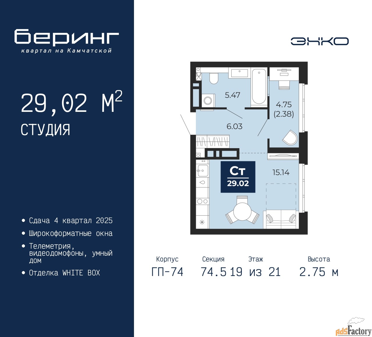 | Высота потолков (м.) | 2.75 |