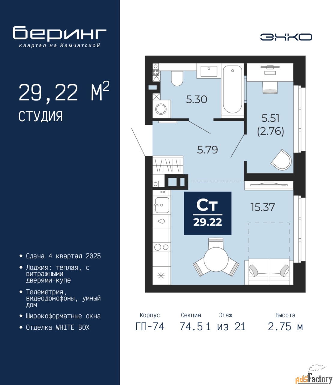 Дом монолитный, многоподъездный, переменной этажности, от 9 до 21 этажей. Квартира находится в 74.5-й секции высотой 21 этаж в корпусе ГП-74. На этаже 7 квартир. В подъезде 1 пассажирский и 1 грузовой лифт. Окончание строительства - 1 квартал 2026 года. Оформление сделки по договору долевого участия.