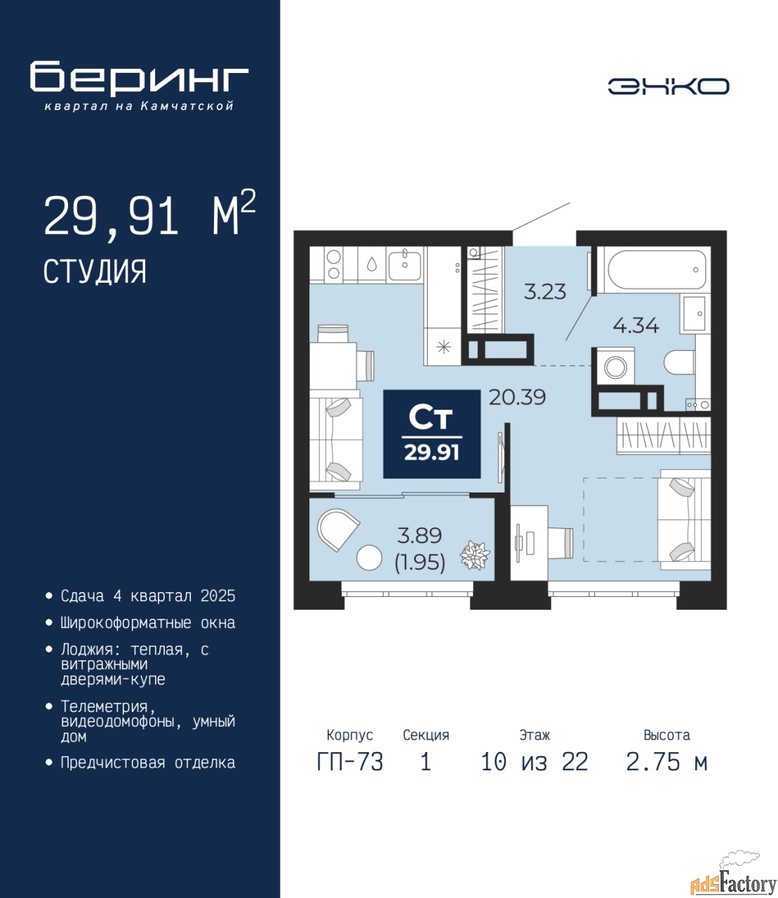 | Высота потолков (м.) | 2.75 |