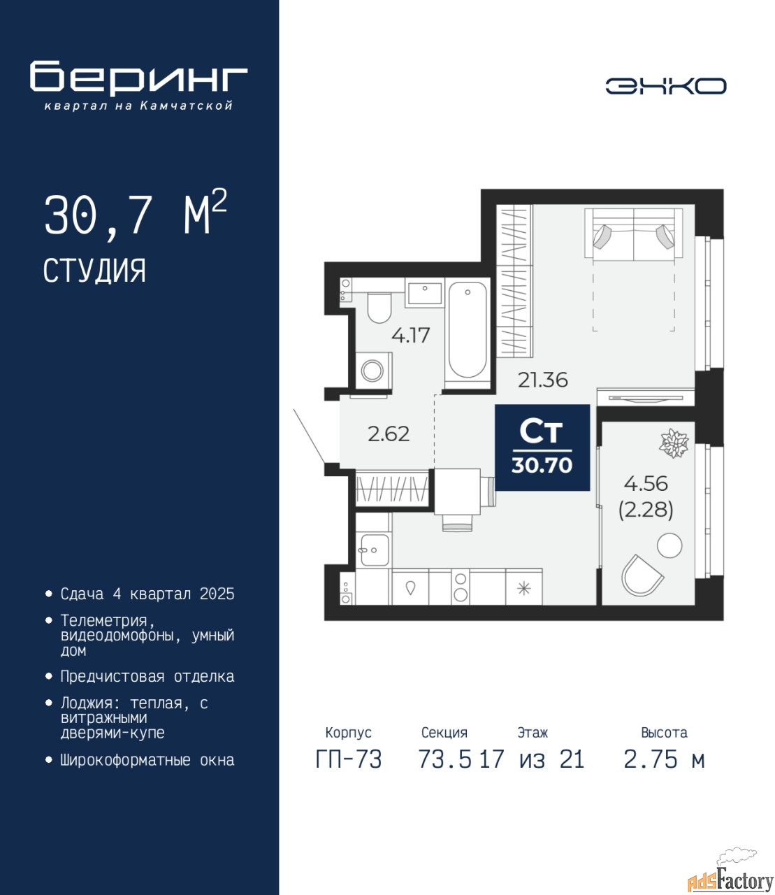 Дом монолитный, многоподъездный, переменной этажности, от 9 до 22 этажей. Квартира находится в 73.5-й секции высотой 21 этаж в корпусе ГП-73. На этаже 6 квартир. В подъезде 1 пассажирский и 1 грузовой лифт. Окончание строительства - 1 квартал 2026 года. Оформление сделки по договору долевого участия.