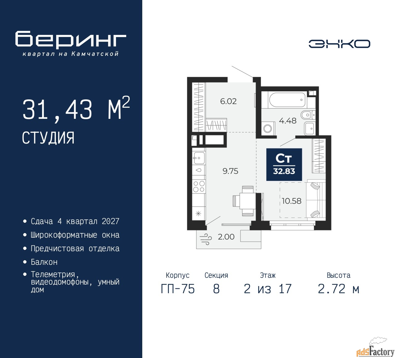 Дом монолитный, многоподъездный, переменной этажности, от 17 до 24 этажей. Квартира находится в 8-й секции высотой 17 этажей в корпусе ГП-75. На этаже 8 квартир. В подъезде 2 пассажирских и 1 грузовой лифт. Окончание строительства - 4 квартал 2027 года. Оформление сделки по договору долевого участия.