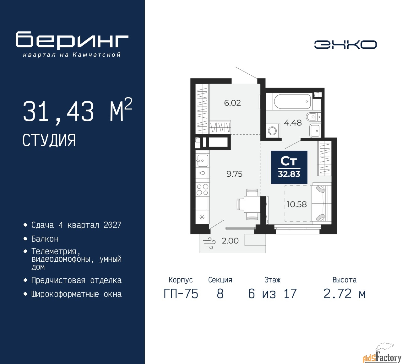 Дом монолитный, многоподъездный, переменной этажности, от 17 до 24 этажей. Квартира находится в 8-й секции высотой 17 этажей в корпусе ГП-75. На этаже 8 квартир. В подъезде 2 пассажирских и 1 грузовой лифт. Окончание строительства - 4 квартал 2027 года. Оформление сделки по договору долевого участия.