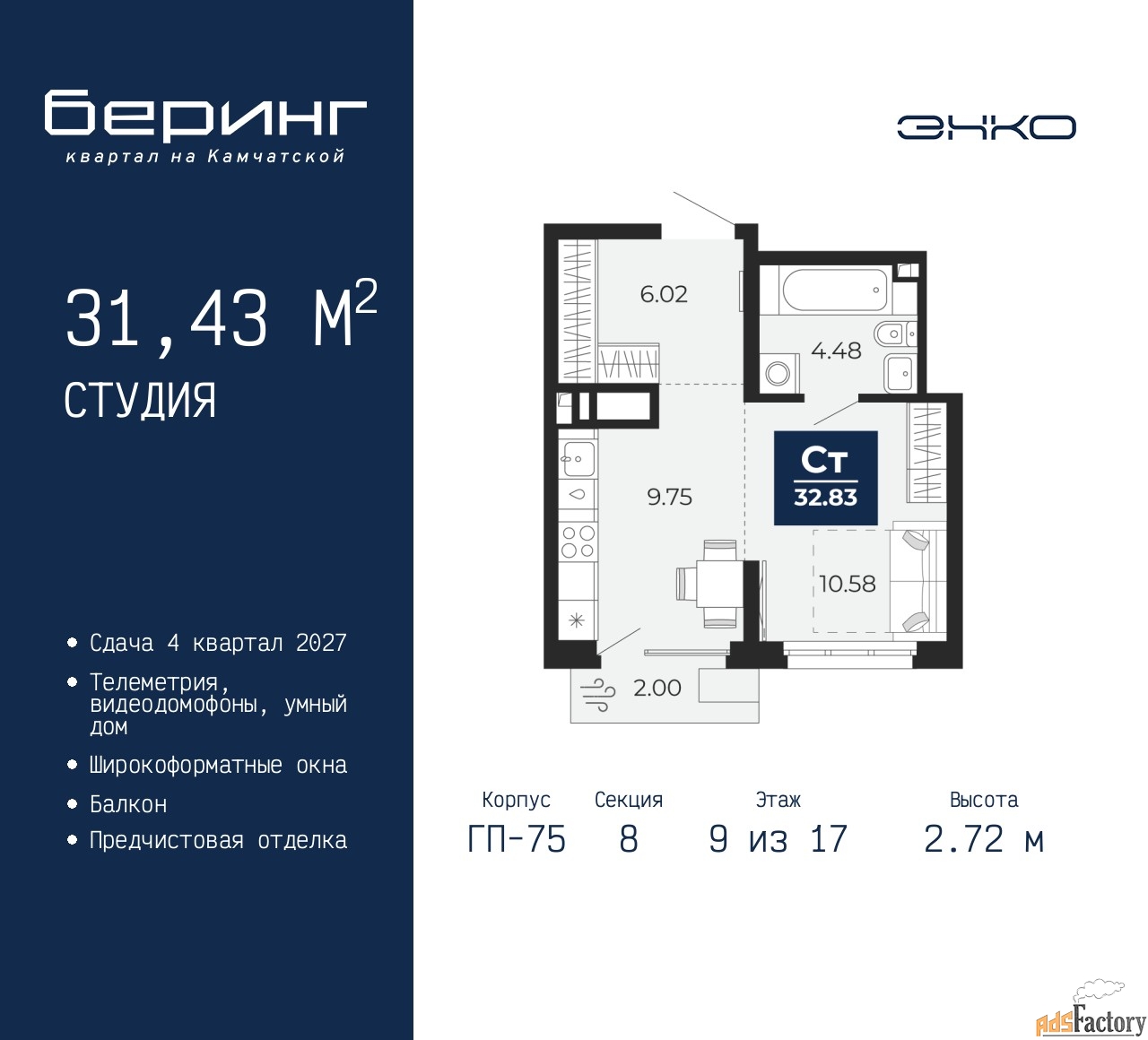 | Высота потолков (м.) | 2.72 |