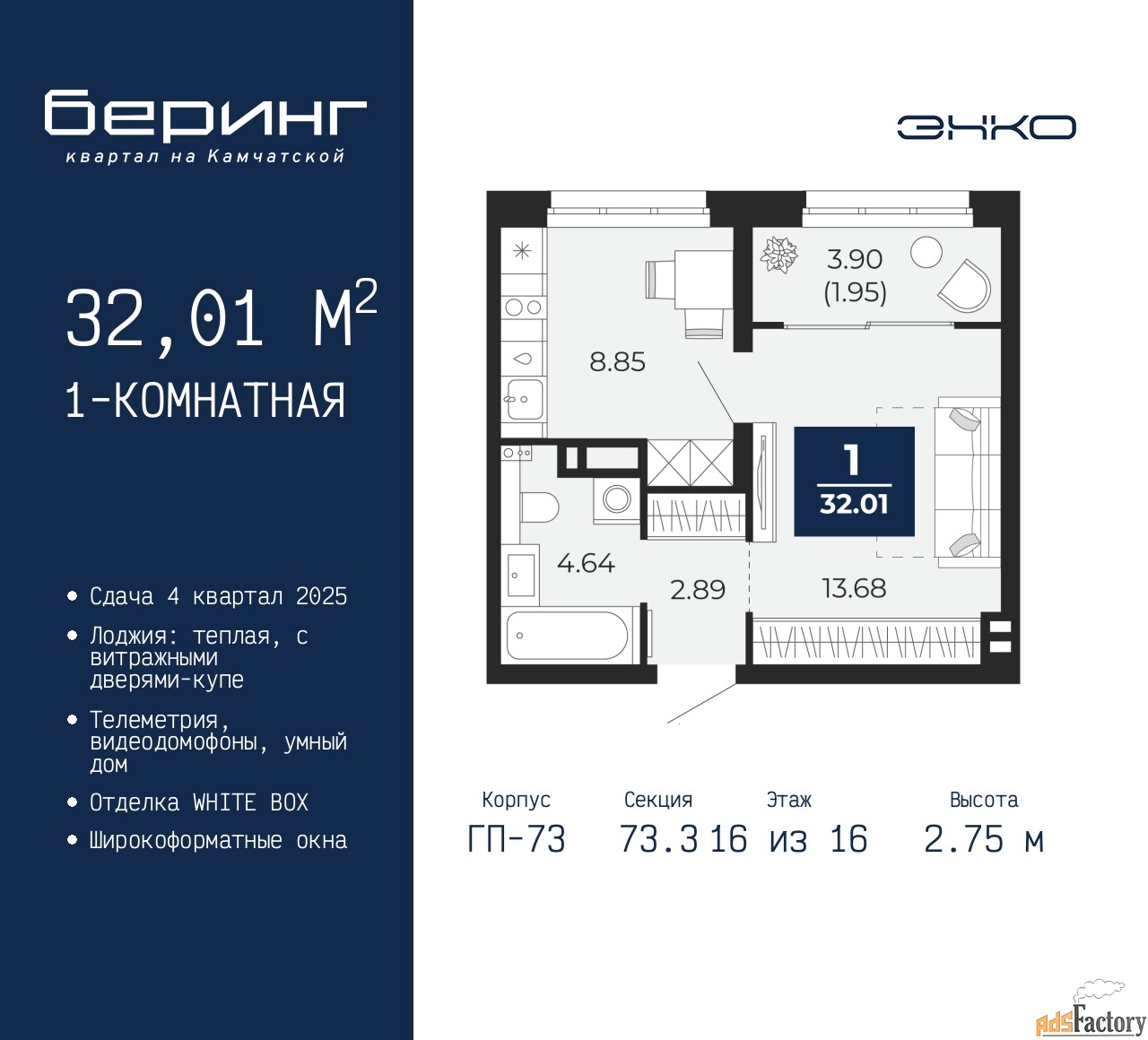 Дом монолитный, многоподъездный, переменной этажности, от 9 до 22 этажей. Квартира находится в 73.3-й секции высотой 16 этажей в корпусе ГП-73. На этаже 8 квартир. В подъезде 1 пассажирский и 1 грузовой лифт. Окончание строительства - 1 квартал 2026 года. Оформление сделки по договору долевого участия.
